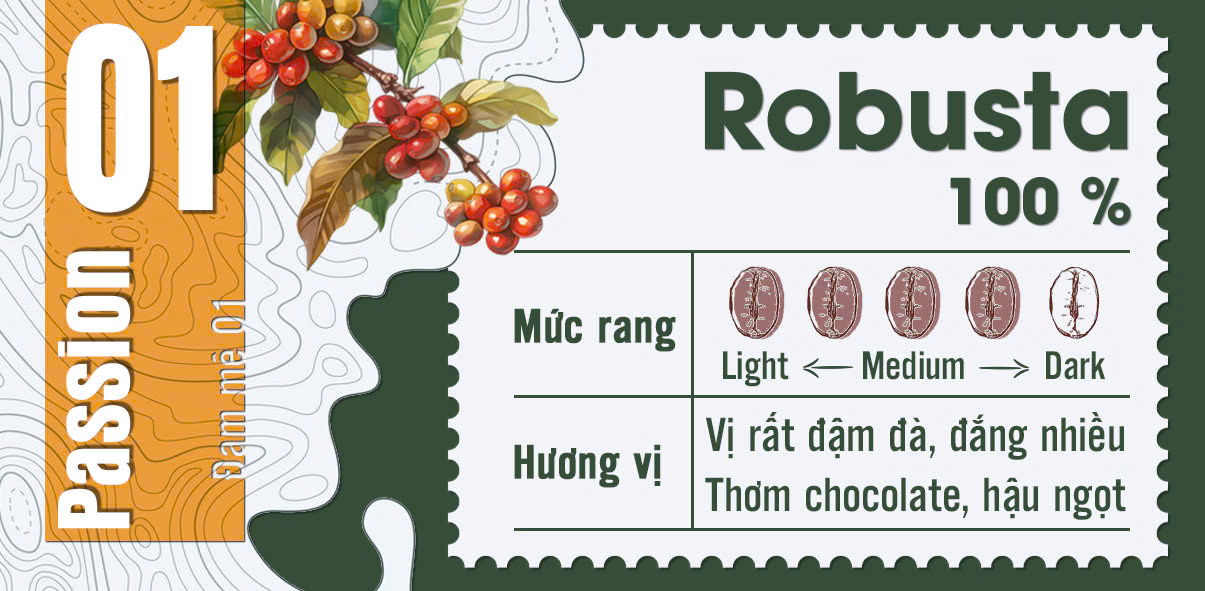 Passion 01 (Đam mê 01) – Robusta 100% với vị đắng mạnh mẽ và hàm lượng caffeine cao, Robusta thường được sử dụng để pha chế các loại cà phê có nồng độ cao như espresso, cà phê đen đá. Robusta cũng là thành phần không thể thiếu trong nhiều loại cà phê hòa tan.